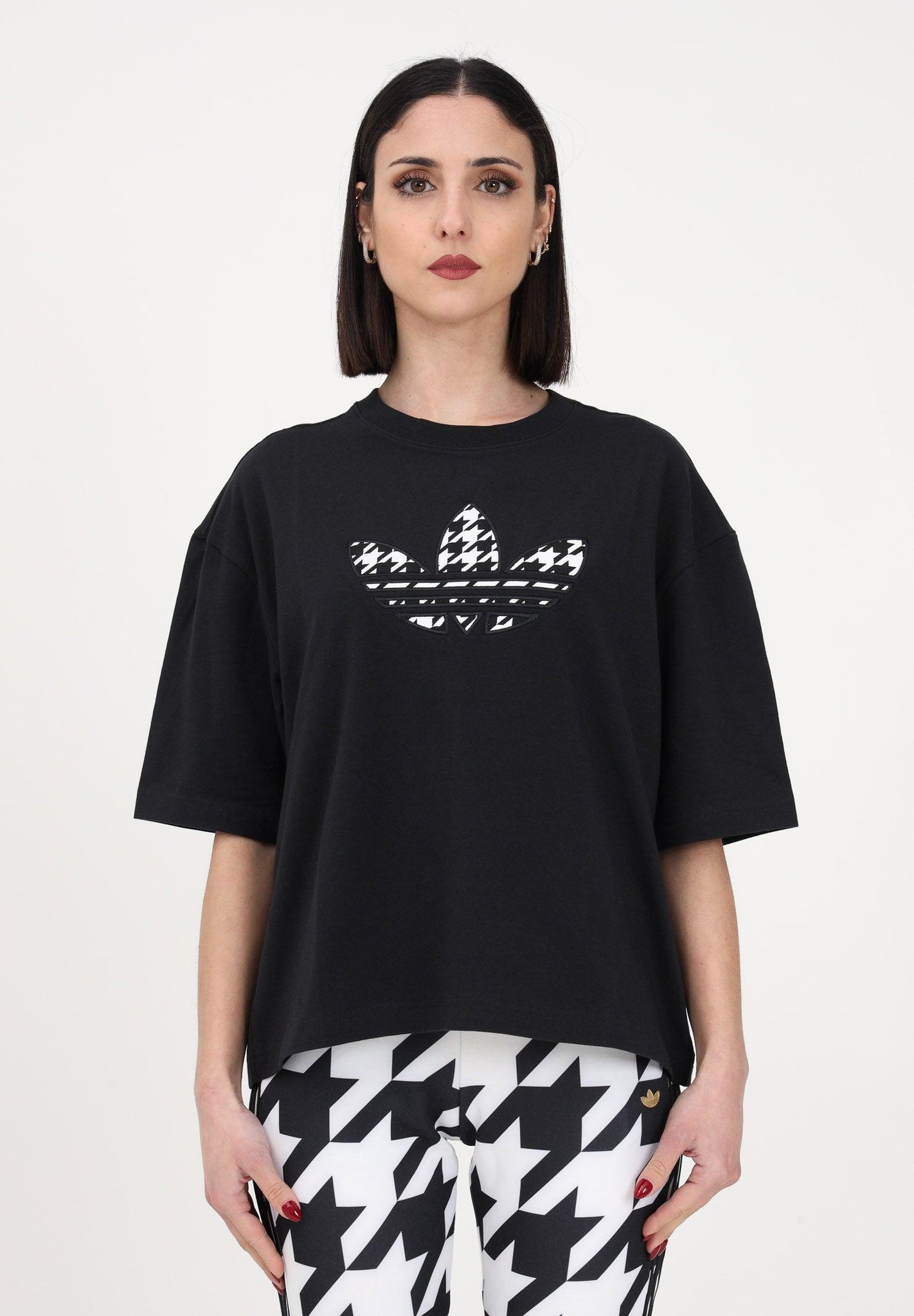 T-shirt sportiva nera da donna. Se ci chiedessi qual'è la cosa che preferiamo di questa t-shirt adidas, non saremmo in grado di scegliere tra due: la silhouette oversize e squadrata e quel pied de poule a sorpresa nel Trifoglio.