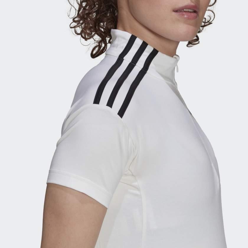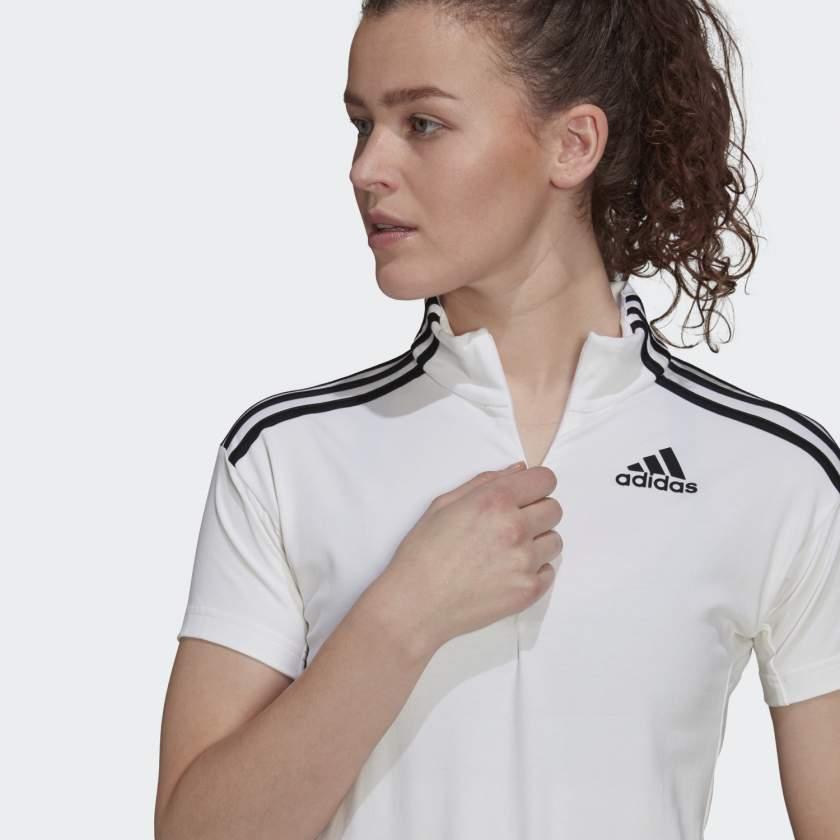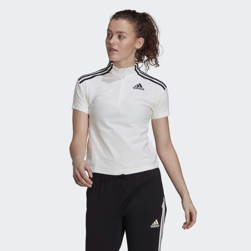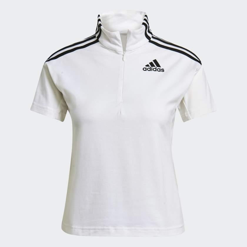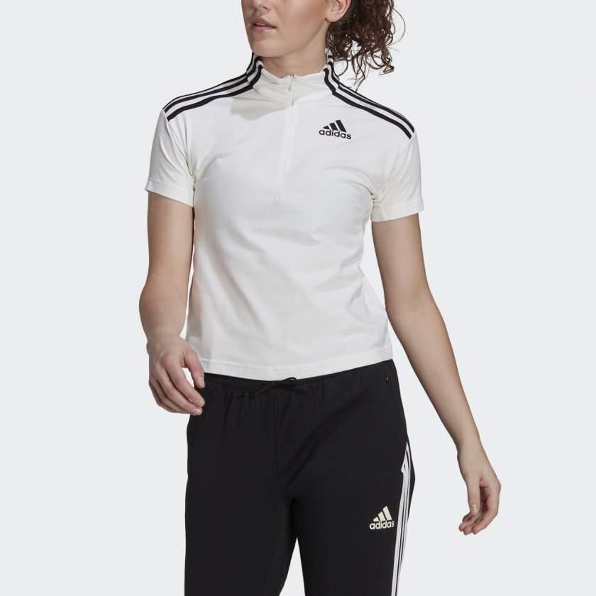 Questa t-shirt adidas con mezza zip mostra il tuo amore per lo sport, con morbido jersey di cotone e 3 strisce sulle maniche.