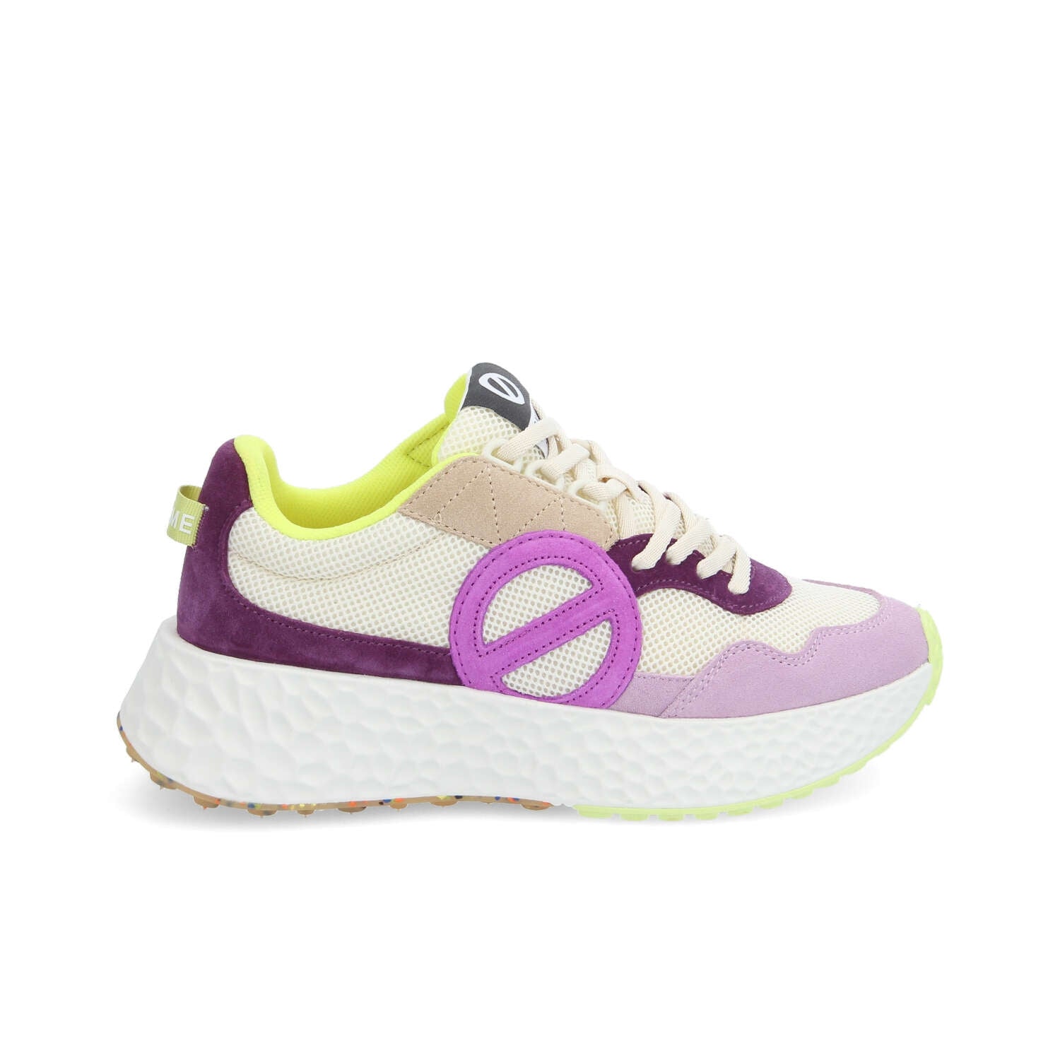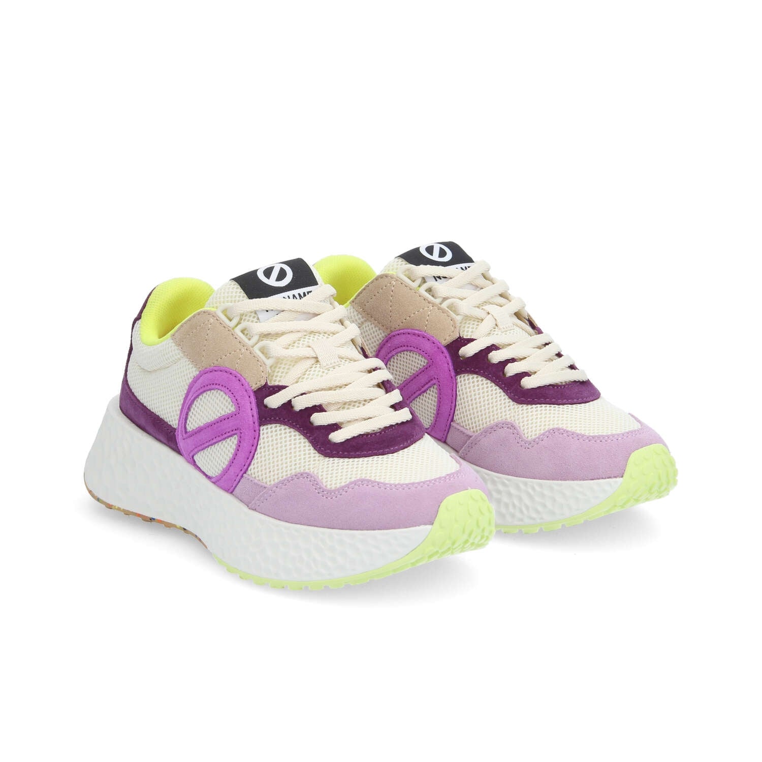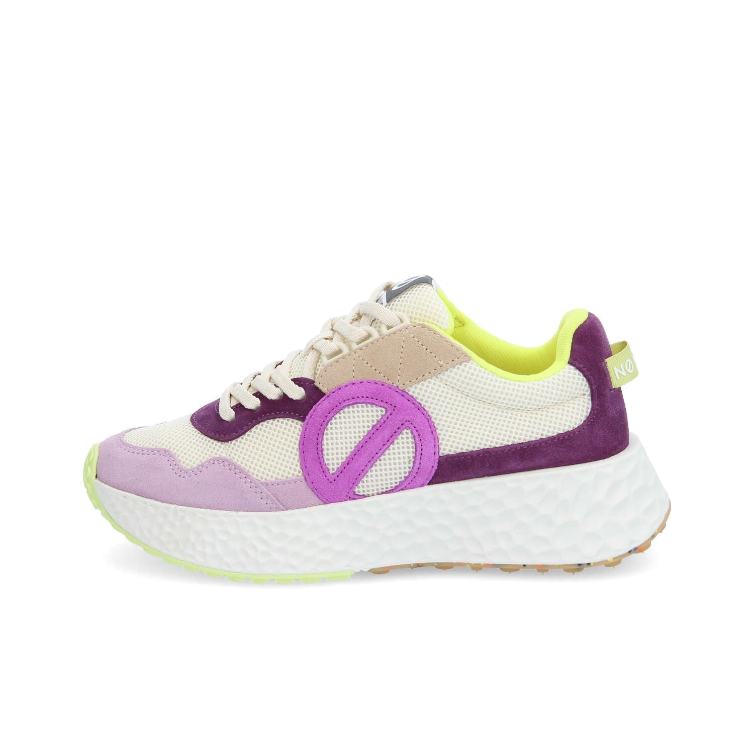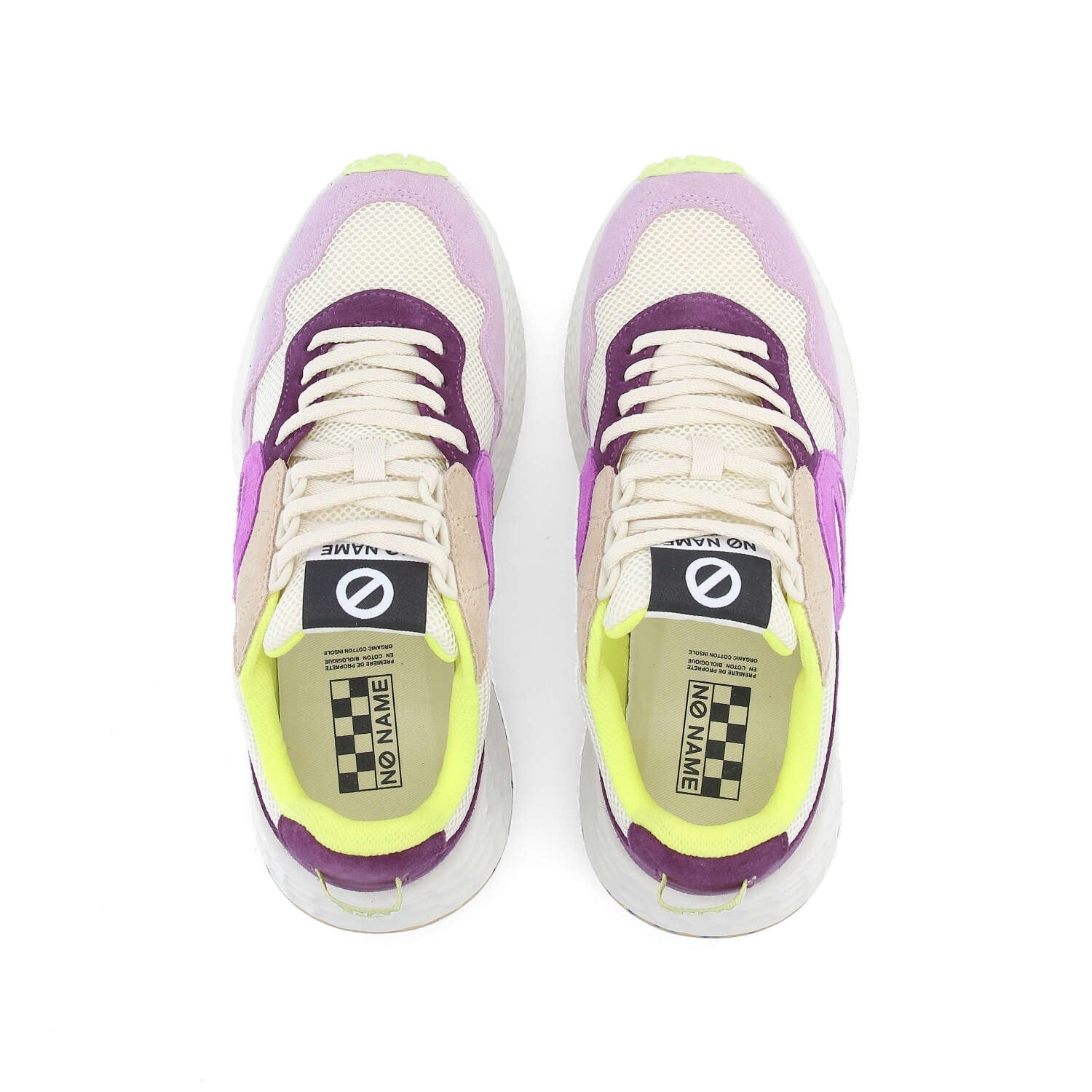 Materiale: 55% pelle scamosciata di vacchetta 45% poliestere riciclato certificato GRS Doppi lacci avorio/lurex Tomaia in pelle scamosciata di vitello e poliestere riciclato Loghi laterali NO NAME Fodera in cotone organico e poliestere certificato GOTS Soletta estraibile in cotone biologico certificato GOTS Linguetta sul tallone con logo Suola ultraleggera in EVA da 5 cm Suola tassellata in gomma riciclata bicolore