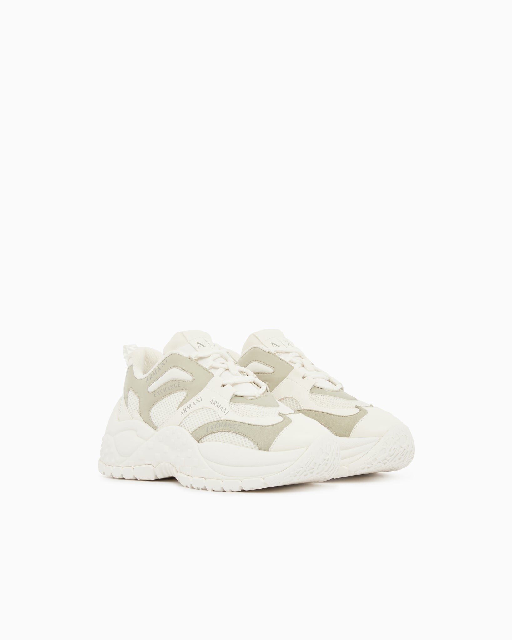 Il design dinamico è impreziosito dal logo Armani Exchange ripetuto sulla tomaia e dalla suola spessa con dettagli geometrici che assicura un'ottima aderenza.