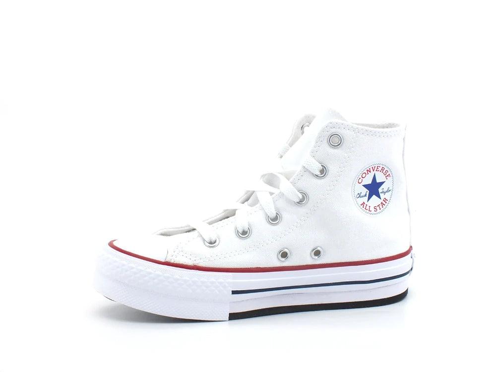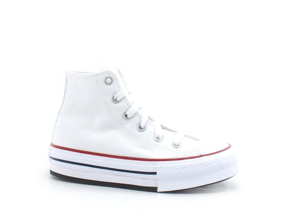 La classica tomaia in tela sovrasta un'intersuola platform in schiuma EVA per uno stile elevato. Il look è rifinito con i classici dettagli Chuck Taylor All Star, come la patch a stella sulla caviglia, le strisce a contrasto sull'intersuola e la suola con motivo a rombi.