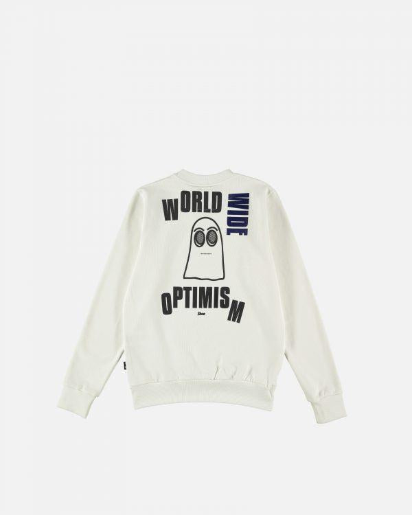 Felpa girocollo con logo frontale e stampa posteriore ” Worldwide Optimism” . Vestibilità rilassata. Composizione: 100% Organic Cotton