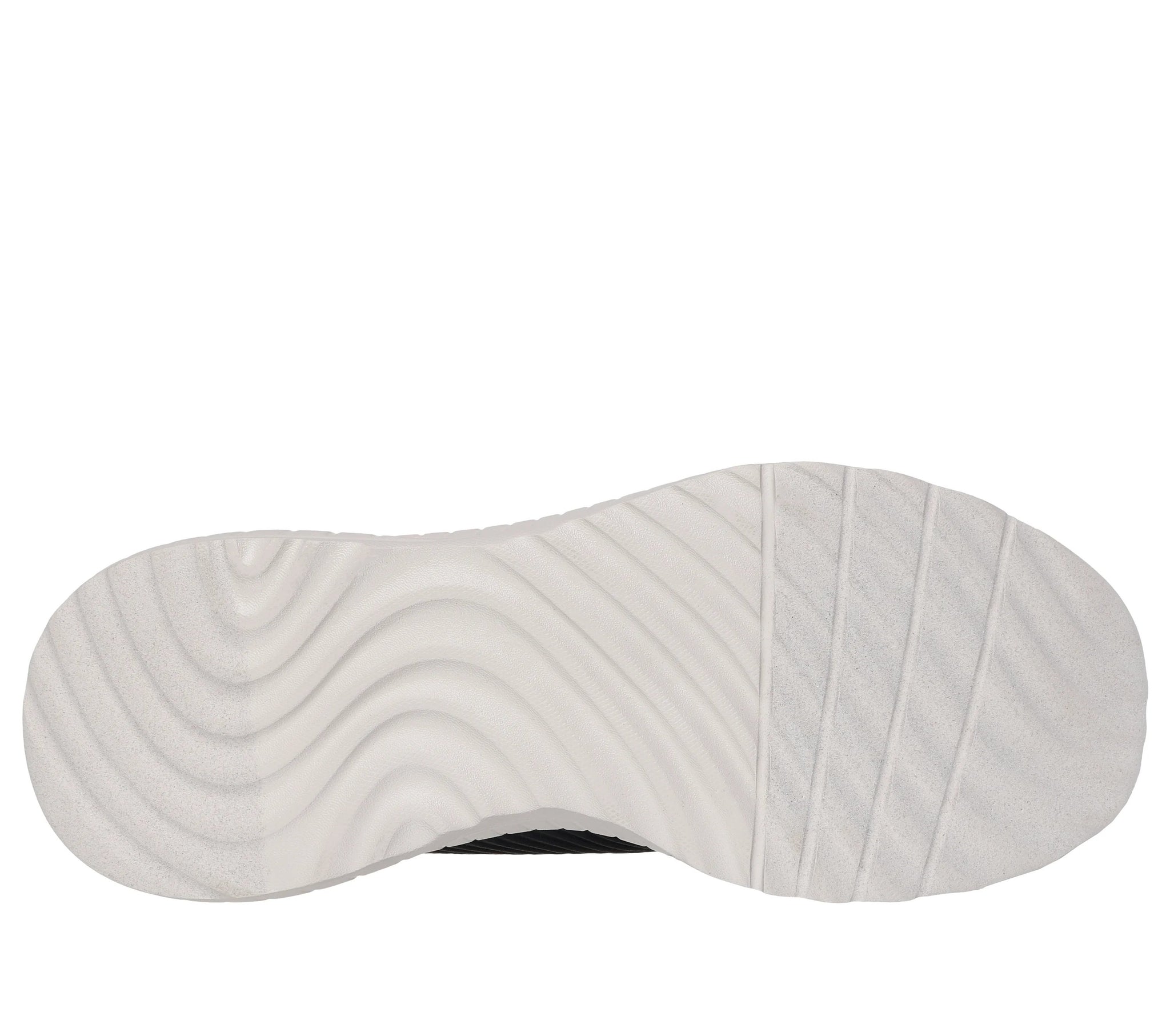 Questa sneaker fashion slip-on presenta una tomaia in materiale tecnico goffrato con lacci elasticizzati, doppio pannello elasticizzato e una soletta ammortizzata Skechers Memory Foam™.