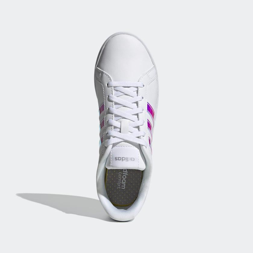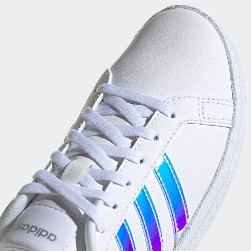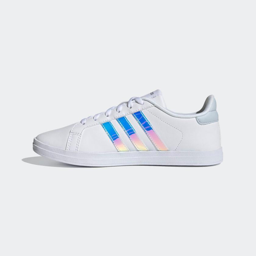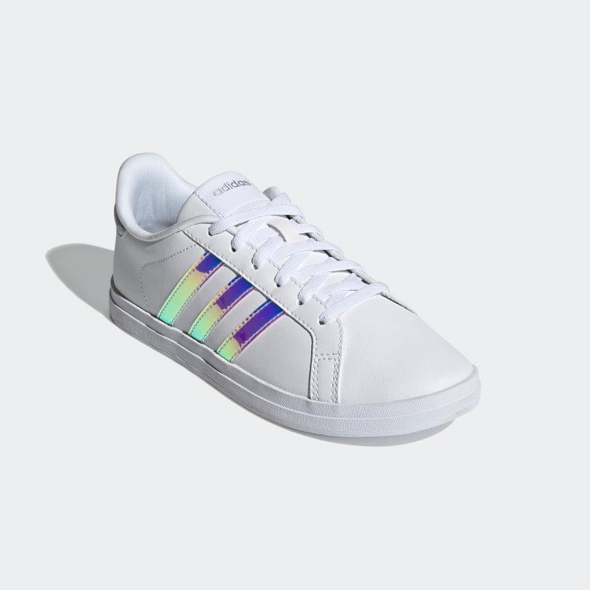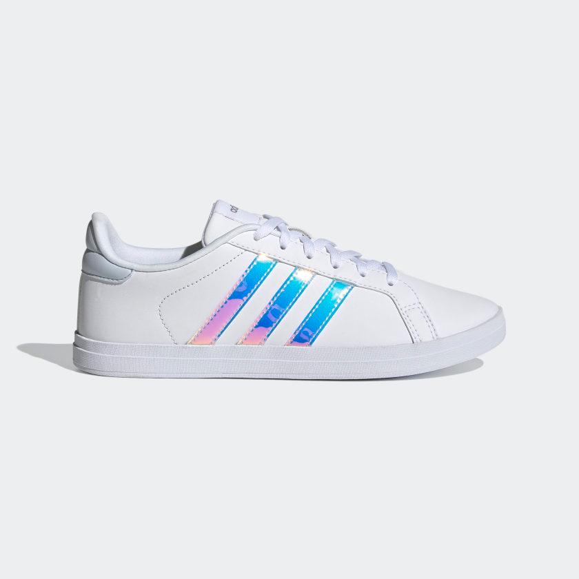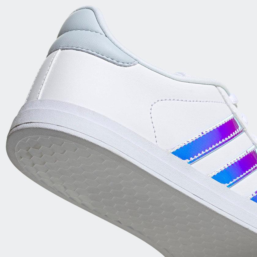 COURTPOINT SCARPE SNEAKERS CLASSICHE IN MORBIDA PELLE SPALMATA. Calcialo con stile con queste scarpe adidas chic. Sono ispirate alle scarpe da tennis sul campo ma con una tomaia elegante e moderna che si adatterebbe altrettanto bene sulla passerella. La soletta Cloudfoam Comfort avvolge il piede in morbida ammortizzazione e mesh traspirante per un comfort che dura tutto il giorno. SPECIFICHE Vestibilità regolare Chiusura con lacci Tomaia in pelle Soletta Cloudfoam Comfort Fodera in tessuto Suola in gomma Colore: Cloud White / Iridescent / Halo Blue Codice prodotto: FY8402
