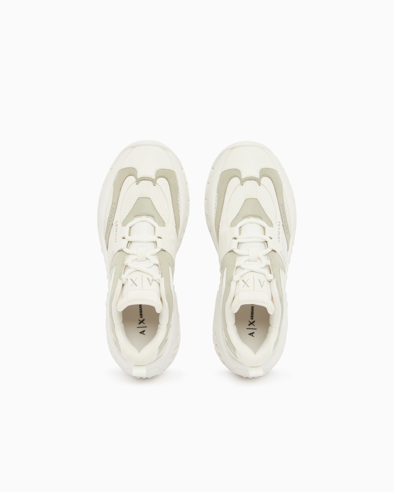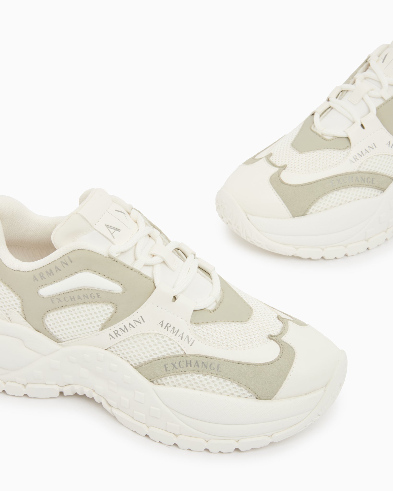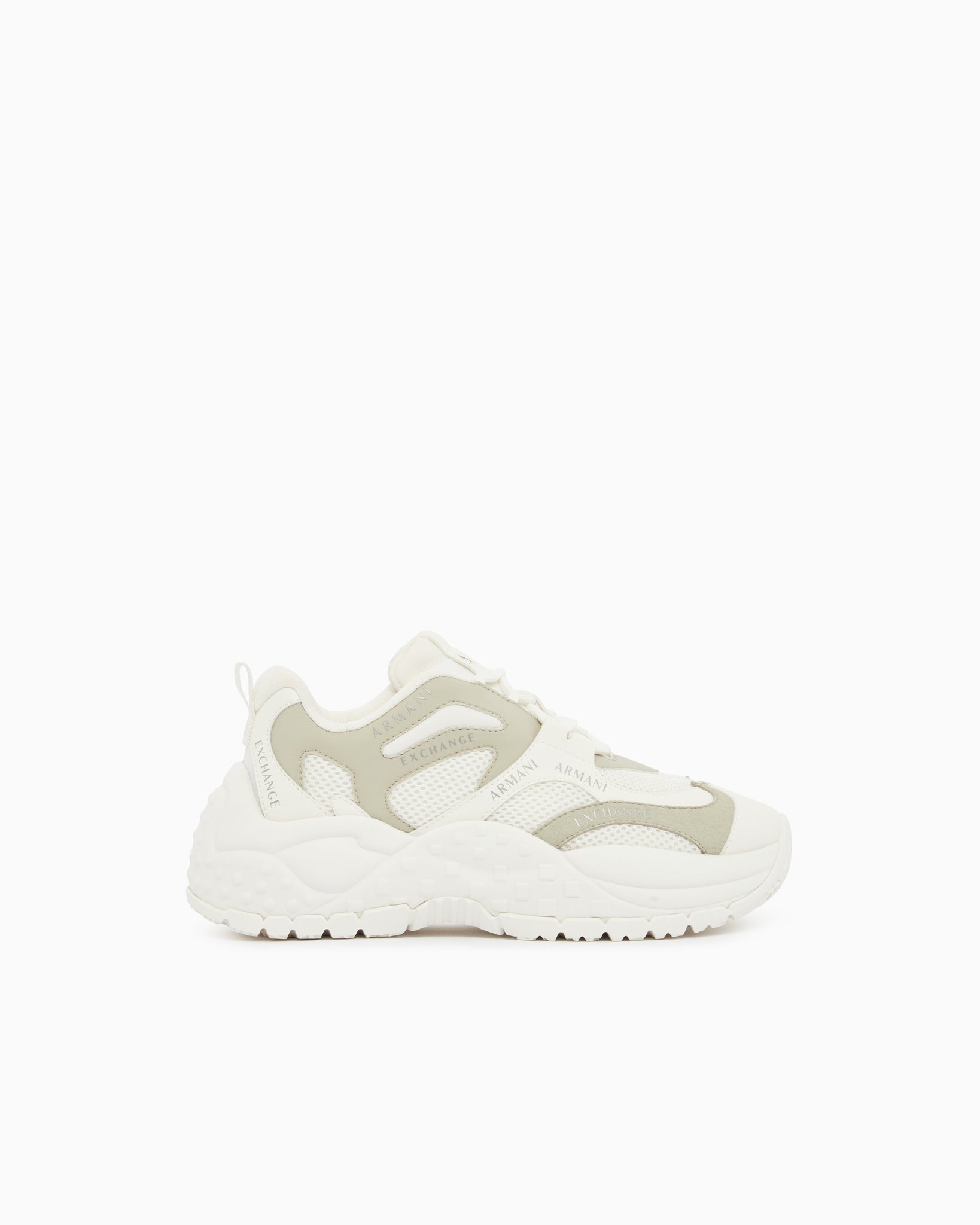 Il design dinamico è impreziosito dal logo Armani Exchange ripetuto sulla tomaia e dalla suola spessa con dettagli geometrici che assicura un'ottima aderenza.