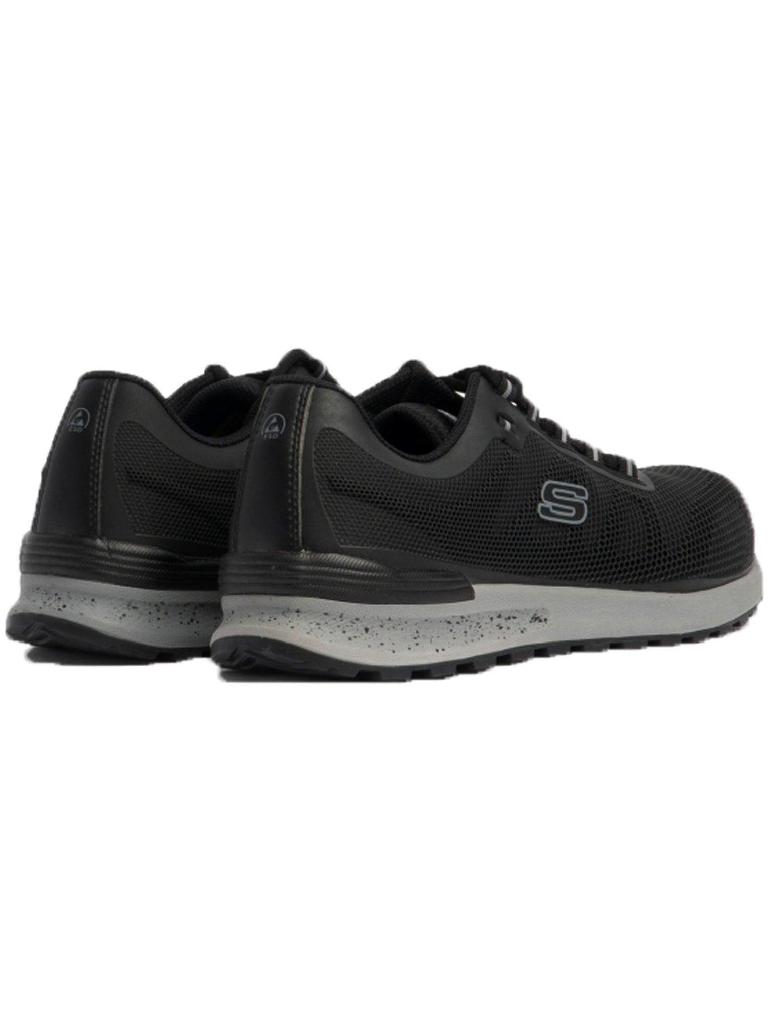 Scarpa da lavoro Skechers da uomo in ecopelle nera con linguetta e laccio in tessuto, fodera in tessuto con sottopiede estraibile e fondo in gomma antiscivolo.